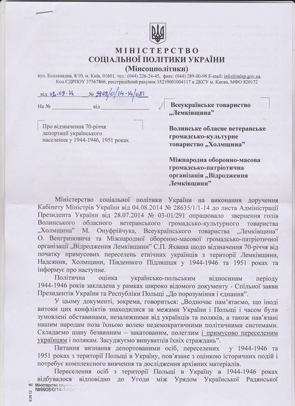 Відповідь Міністерства соціальної політики України на звернення до Президента України голів Волинського обласного ветеранського громадсько-культурного товариства "Холмщина" М.Онуфрійчука, Всеукраїнського товариства "Лемківщина" О.Венгриновича та Міжнародної оборонно-масової громадсько-патріотичної організації "Відродження Лемківщини" С.Яхвана.