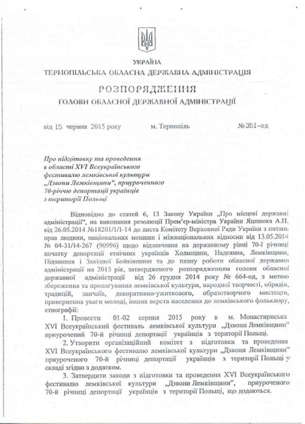 Розпорядження голови Тернопільської обласної державної адміністрації про підготовку та проведення XVI Всеукраїнського фестивалю лемківської культури "Дзвони Лемківщини", приуроченого 70-річчю депортації українців з території Польщі.