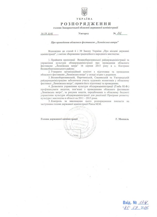 Закарпатська "Ватра" Ivanna Skliarova 03 серпня 2015 Перегляди: 449 Розпорядження голови Закарпатської ОДА Про проведення обласного фестивалю "Лемківська ватра". Facebook Twitter