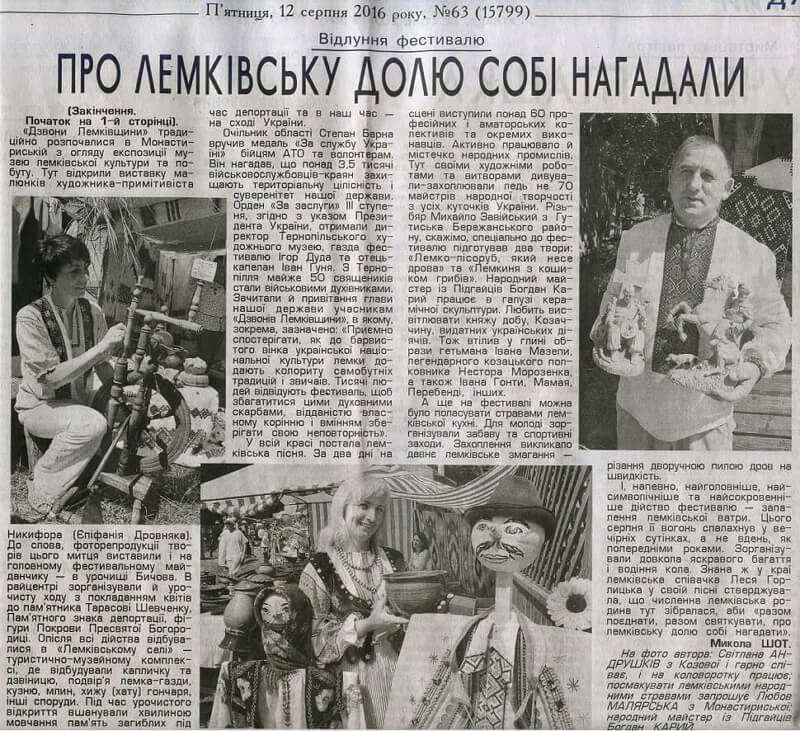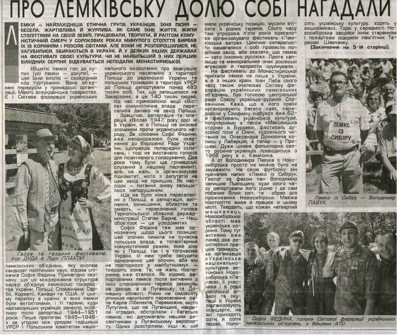 Про лемківську долю собі нагадали Ivanna Skliarova 13 серпня 2016 Перегляди: 563 Стаття у газеті "Вільне життя" №63(15799) від 12 серпня 2016 року Facebook Twitter Попередня Наступна