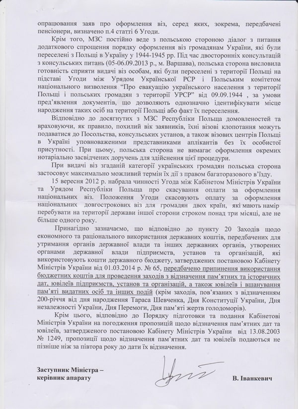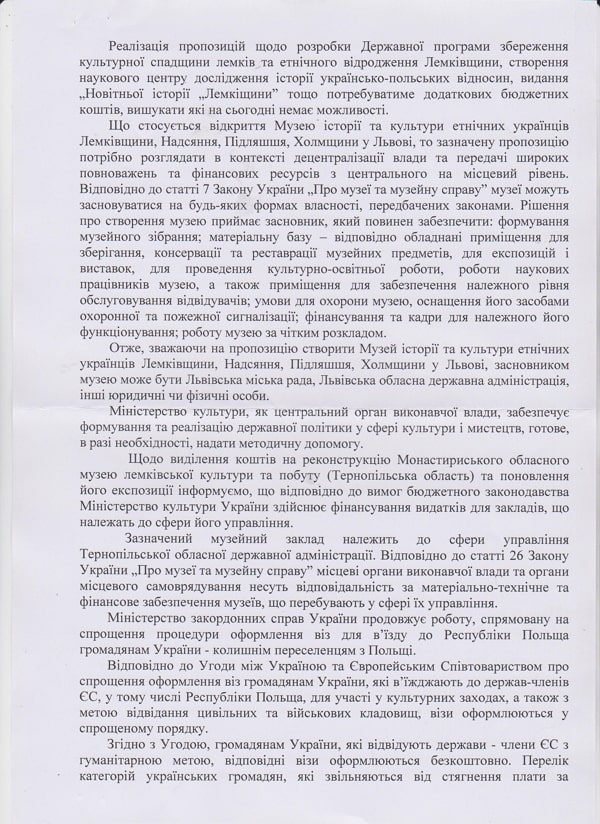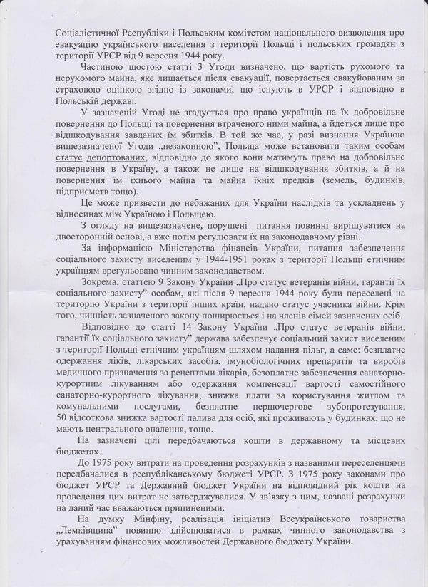 Відповідь Міністерства соціальної політики України на звернення до Президента України голів Волинського обласного ветеранського громадсько-культурного товариства "Холмщина" М.Онуфрійчука, Всеукраїнського товариства "Лемківщина" О.Венгриновича та Міжнародної оборонно-масової громадсько-патріотичної організації "Відродження Лемківщини" С.Яхвана.