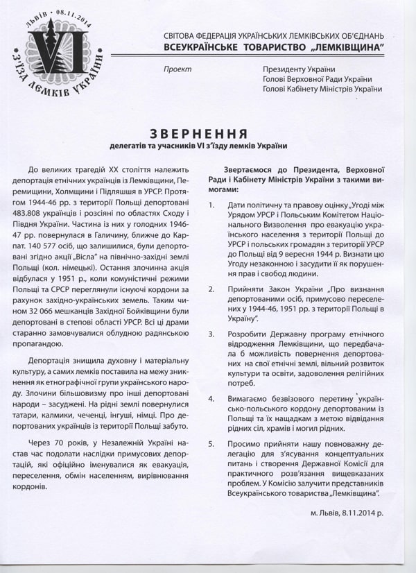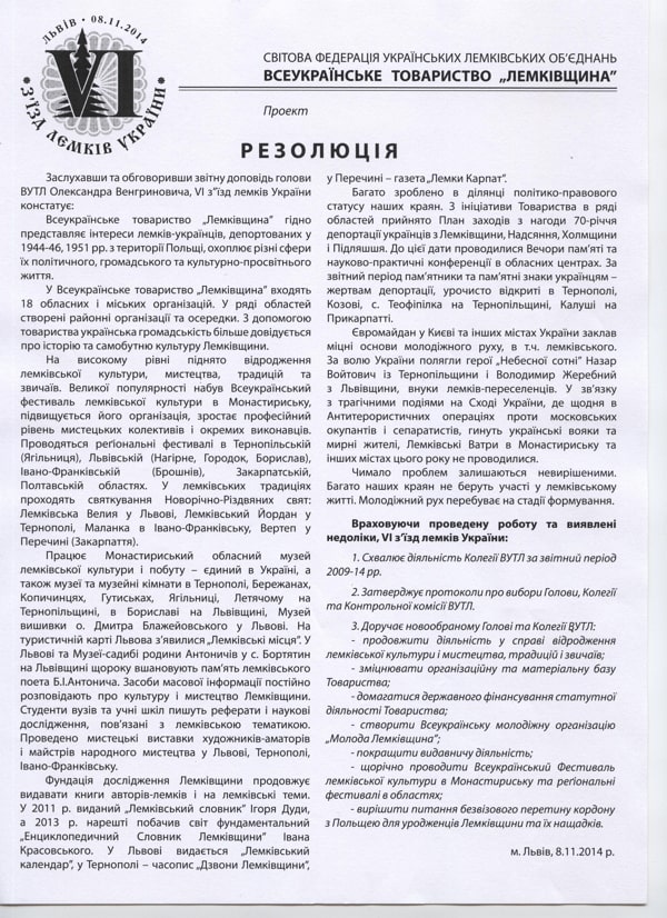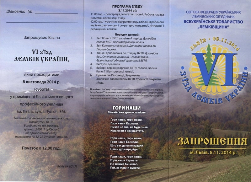 8 листопада 2014 р. у приміщенні Львівського вищого професійного училища (м. Львів, вул. І. Пулюя, 36) відбудеться VI з’їзд ЛЕМКІВ УКРАЇНИ.