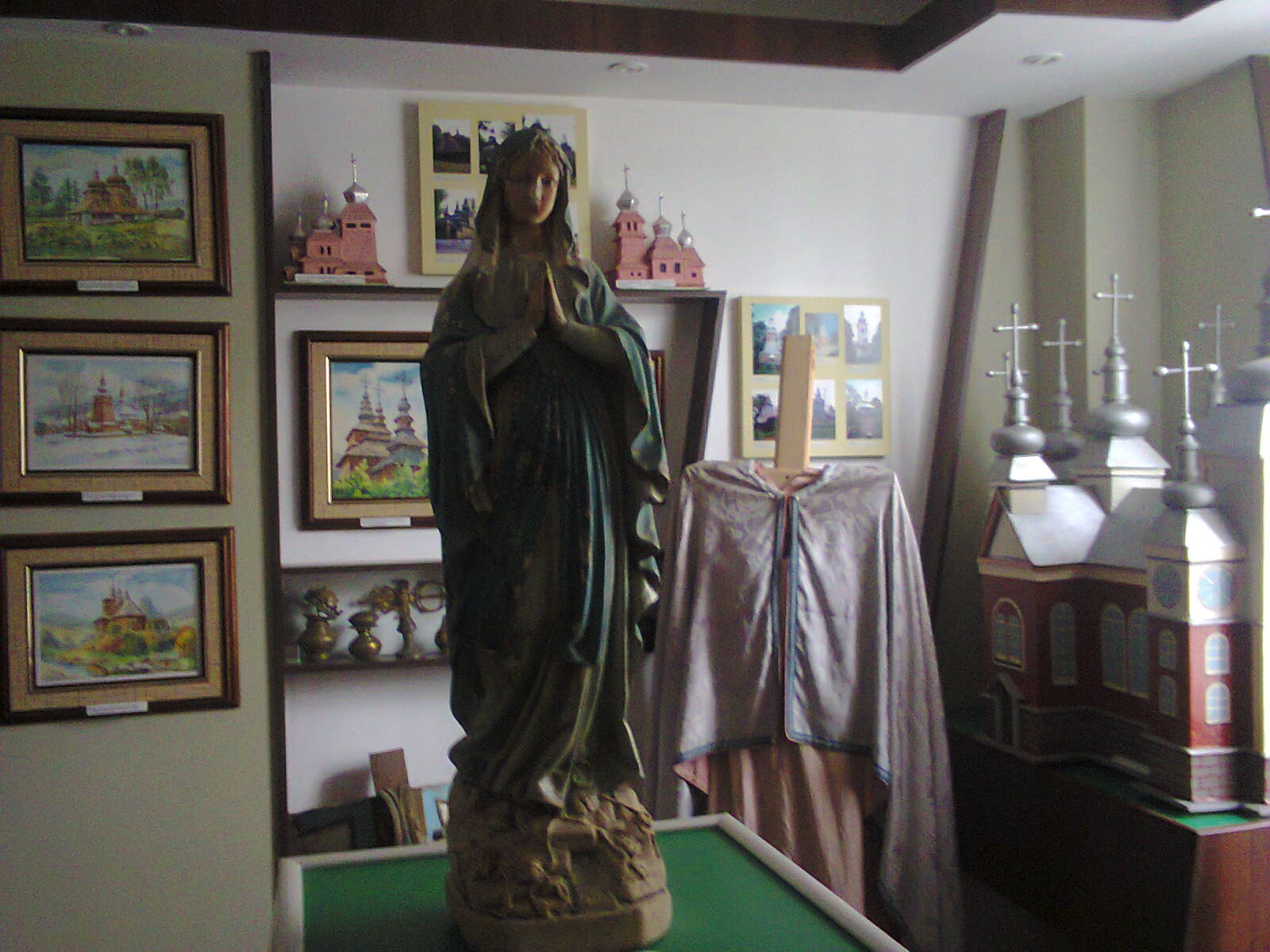 В другому залі –по центру – виставлена скульптура Пресвятої Богородиці (гіпс), подарована сім’єю Ждиняків,
